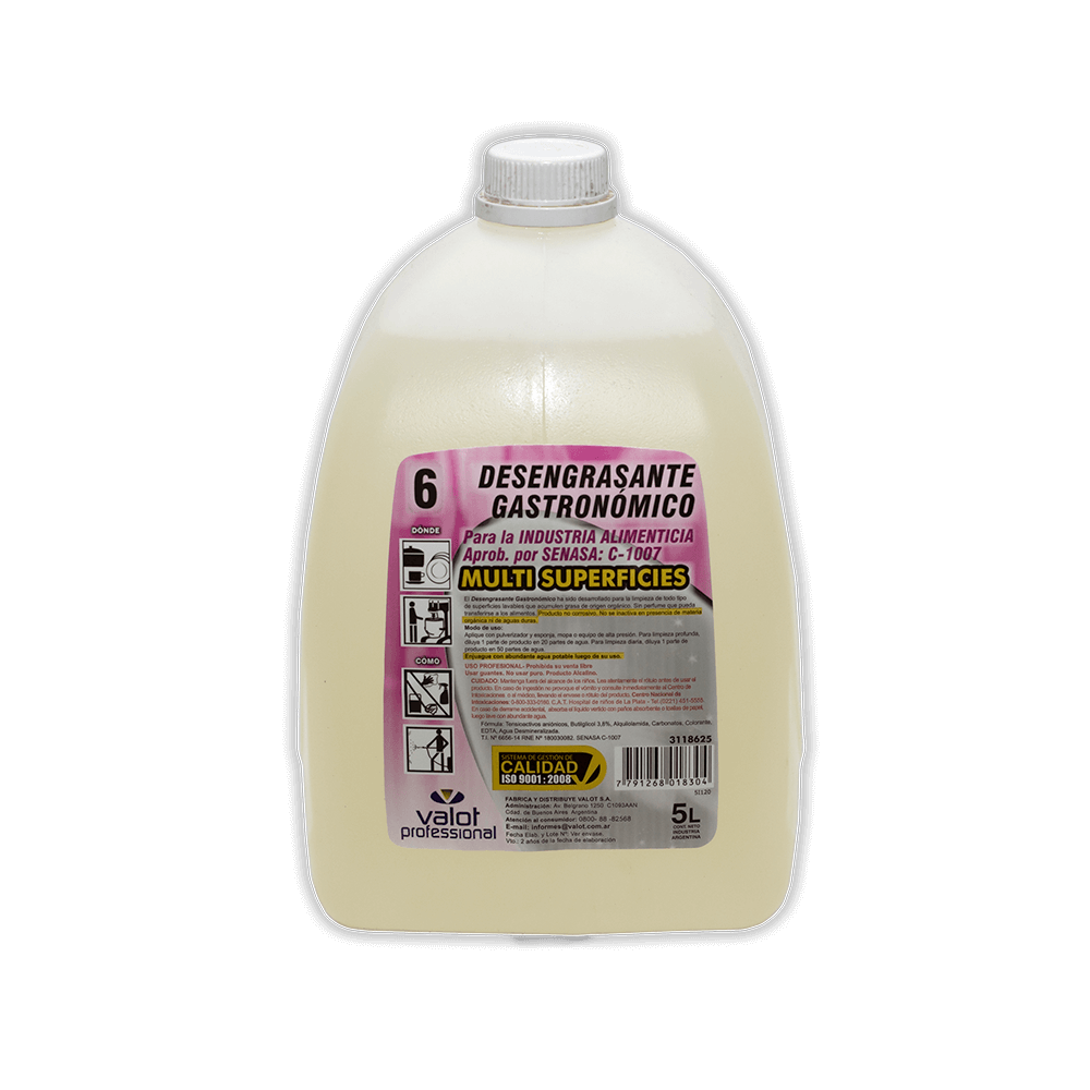 Para la limpieza de todo tipo de superficies lavables que acumulen grasa de origen orgánico como los extractores de cocina, paredes, pisos, mesadas, etc. Es biodegradable, no corrosivo, no contiene esencias que puedan contaminar los alimentos.